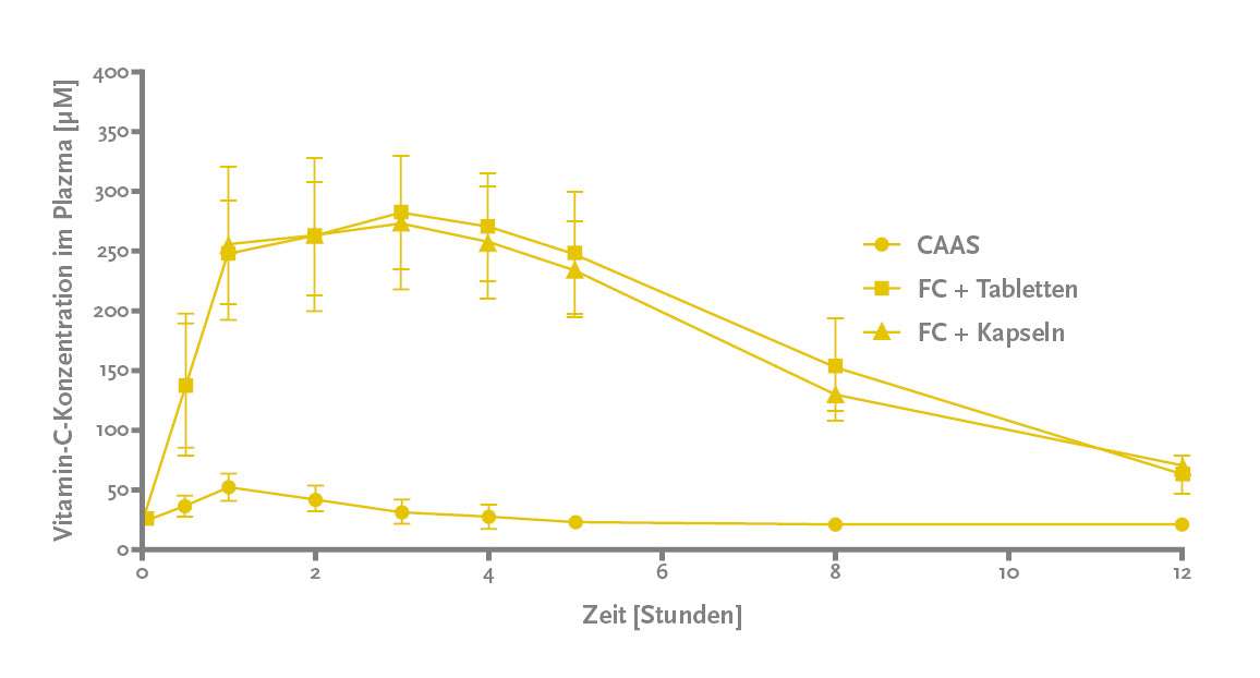 Das nachstehende Diagramm stammt aus einer klinischen Studie aus dem Jahr 2021 und zeigt, um wie viel eine Einzeldosis von 1000 mg Ca-Ascorbat (910 mg Vitamin C) den Blutspiegel von 14 Teilnehmern erhöhte und um wie viel eine Einzeldosis von 1 g Fenu-C+ (350 mg Vitamin C) in Tabletten- bzw. Kapselform den Blutspiegel erhöhte. (CAAS zeigt die Gruppe, die 910 mg normales Vitamin C bekam, während FC+ die Gruppe zeigt, die 350 mg Vitamin C bekam, das mit der Hybrid-FenuMAT™-Technologie verarbeitet wurde, d. h. Fenu-C+). [2]