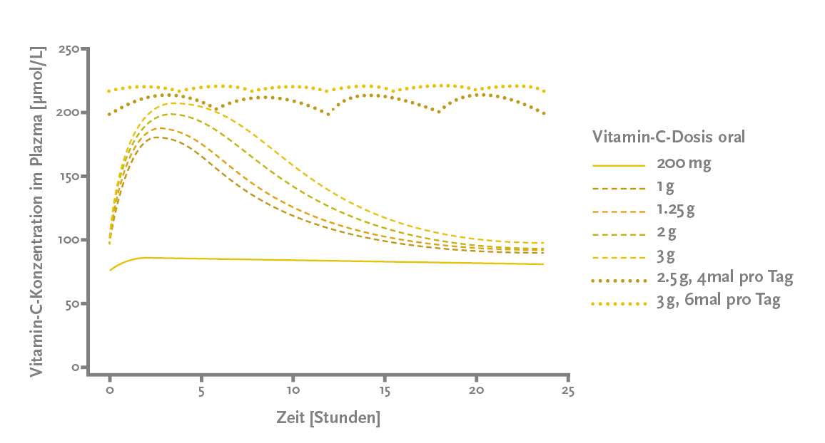 Die folgende Grafik zeigt, dass durch die Einnahme von 18 g (3 x 6 g) Vitamin C pro Tag höchstens ein Wert von 220 µM/L aufrecht erhalten werden kann, während durch die Einnahme von 10 g (4 x 2,5 g) pro Tag 200 µM/L erhalten bleiben. [3] Das gilt natürlich nur, wenn es keinen Durchfall verursacht, der bei so großen Mengen jedoch typischerweise auftritt. Außerdem ist es nicht empfehlenswert, mehr als 2 g Vitamin C pro Tag in Form von Nahrungsergänzungsmitteln einzunehmen.