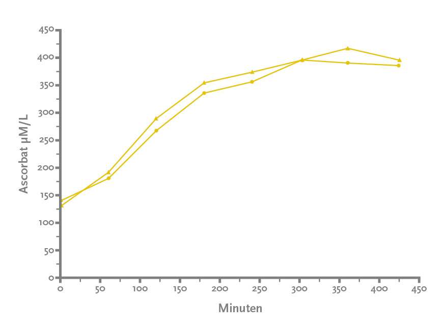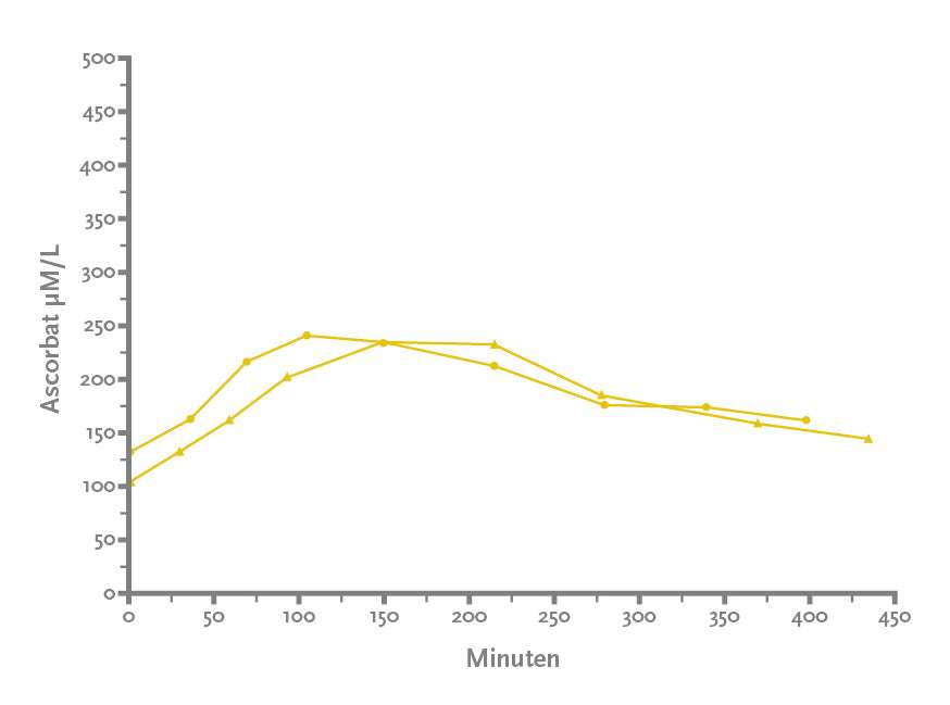 Das folgende Diagramm zeigt die Wirkung von 36 g liposomal verarbeitetem Vitamin C auf den Vitamin-C-Spiegel im Blut. (Es wurden 2 Probanden getestet, deren Ergebnisse in separaten Diagrammen dargestellt sind, sodass hier kein Vergleich mit normalem Vitamin C gezogen wird).