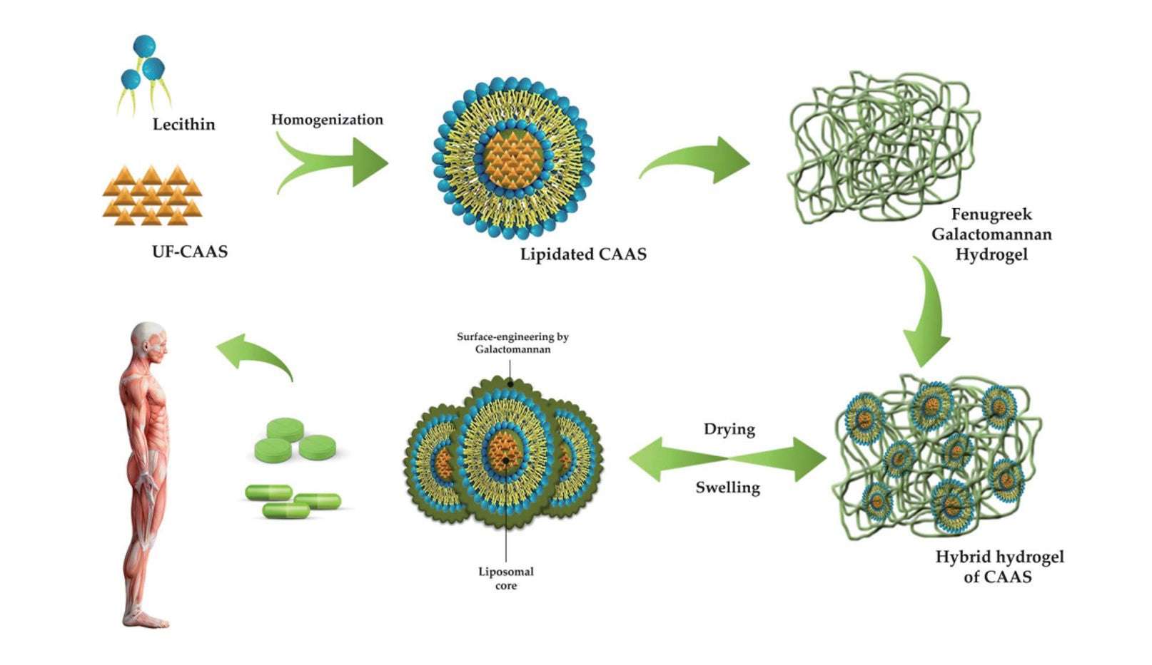 Diese mit Vitamin C gefüllten Liposomen werden dann auch mit einer so genannten FenuMAT™-Technologie verarbeitet, das heißt, sie werden in eine Matrix aus einer speziellen Faser aus Bockshornkleesamen eingefügt. Auf diese Weise entsteht ein Hydrokolloid-System, das in Liposomen verkapseltes Vitamin C enthält, das anschließend gefriergetrocknet wird. Dazu werden lediglich Sonnenblumenlecithin und Bockshornkleesamenfasern verwendet. [1]